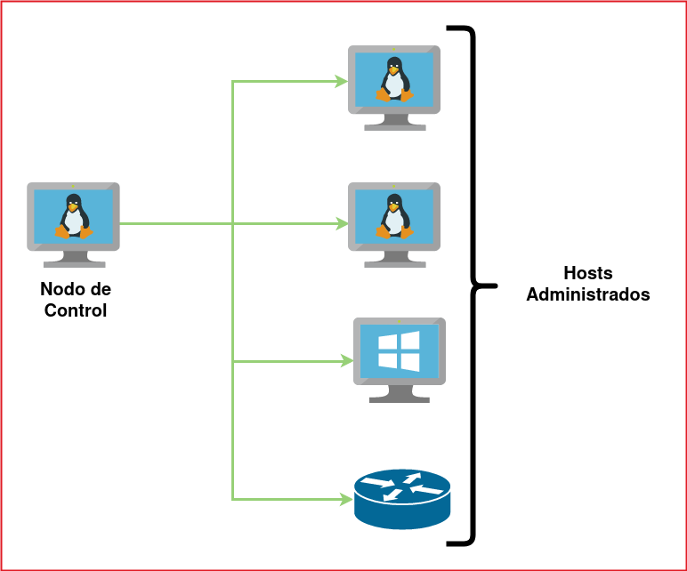 Por lo anterior Ansible se instala unicamente en el nodo de control, y los nodos administrador solamente deben contar en el caso de GNU/Linux con acceso por SSH (recomendado autenticación con llaves) y Python.